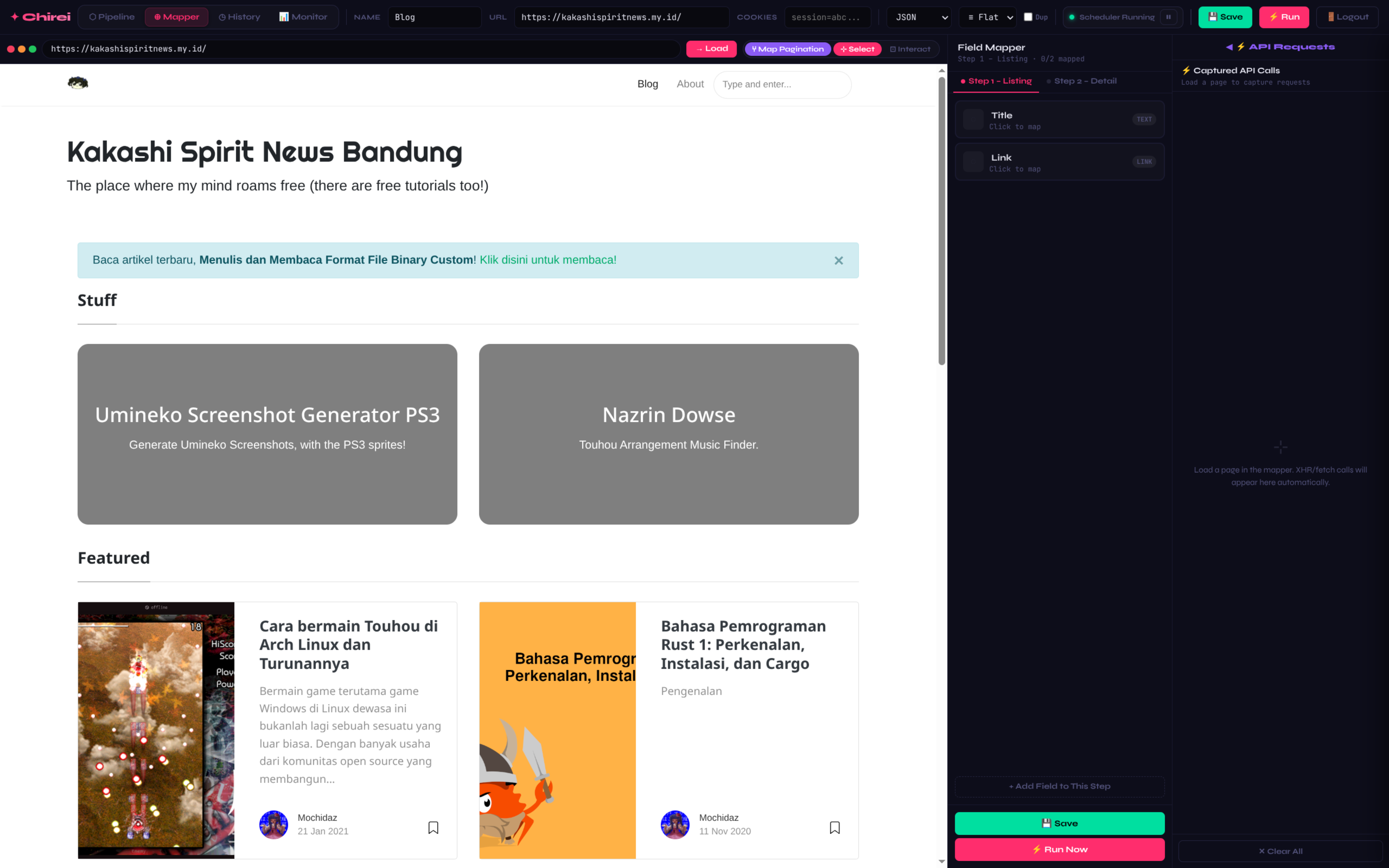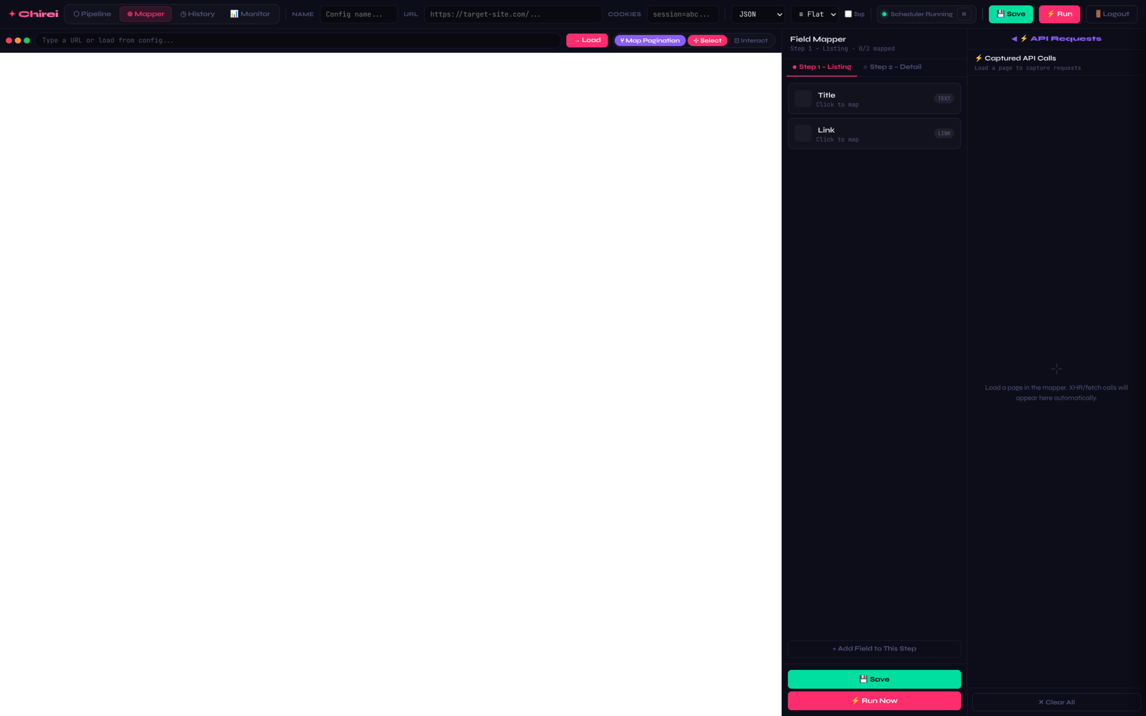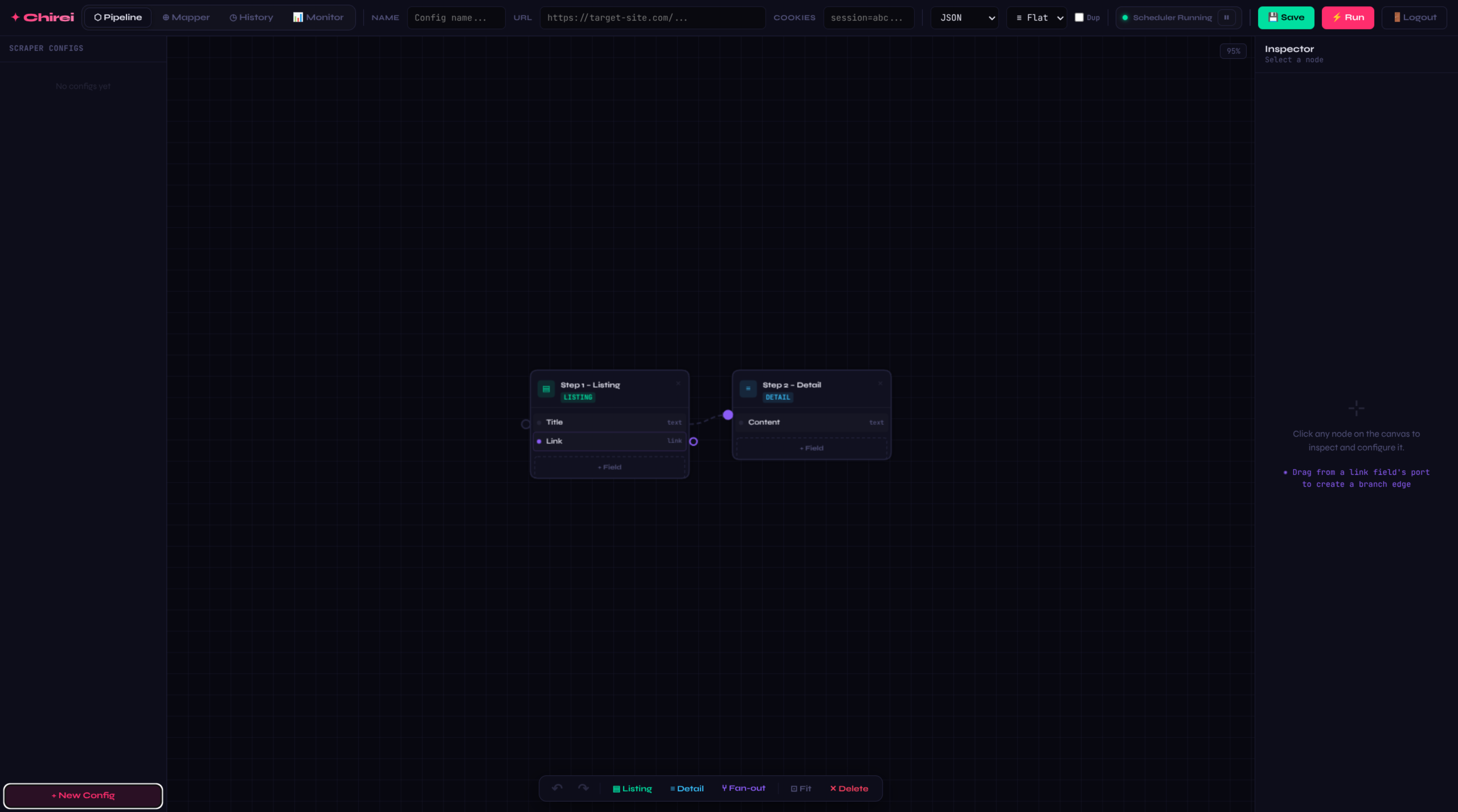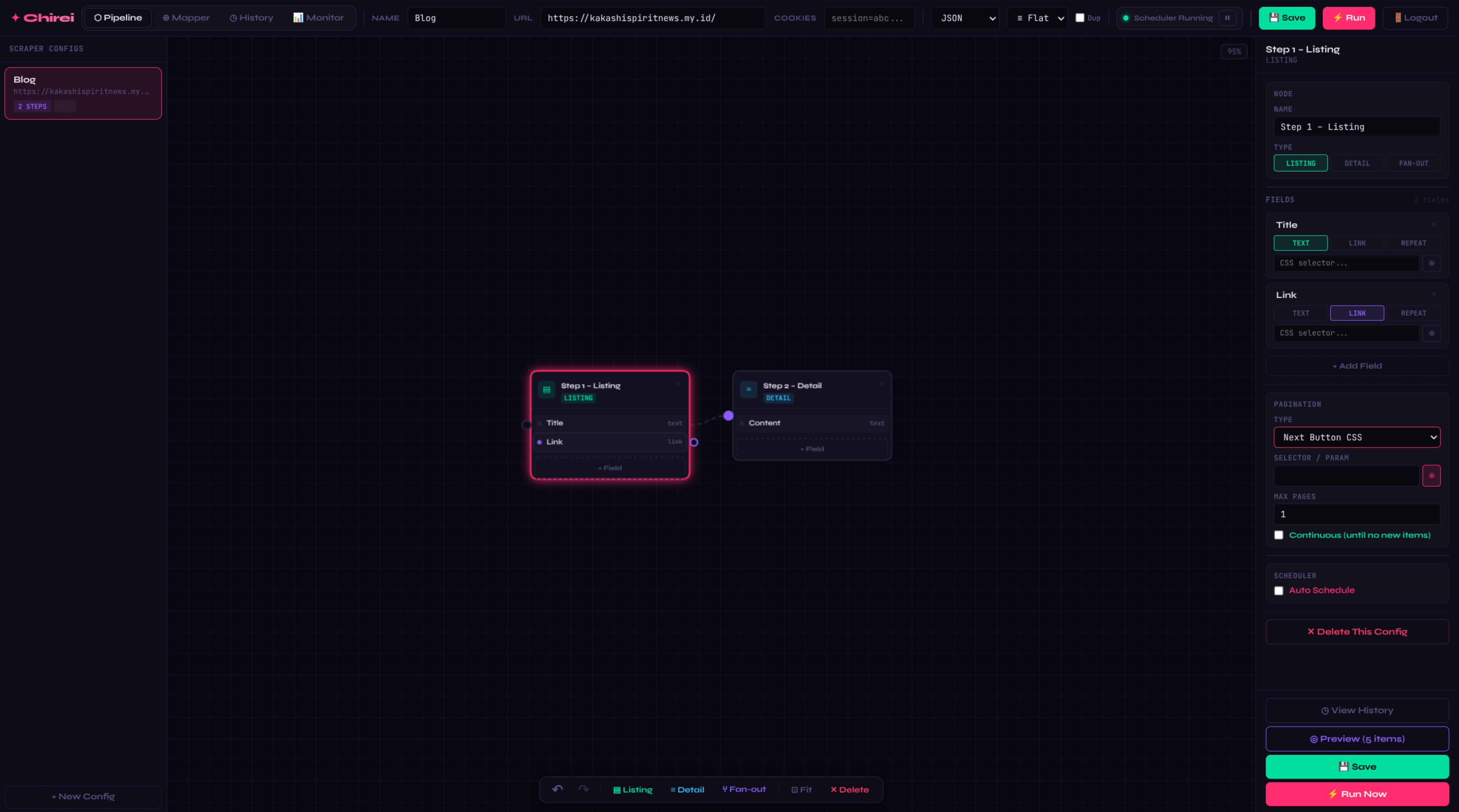 Chirei adalah web scraper yang dikonfigurasi secara visual dan dirancang untuk mempermudah alur ekstraksi multi-langkah (Listings, Detail Pages, Fanouts). Dibangun dengan FastAPI, Celery, Redis, dan PostgreSQL, Chirei sangat skalabel dan cocok untuk lingkungan staging maupun produksi.