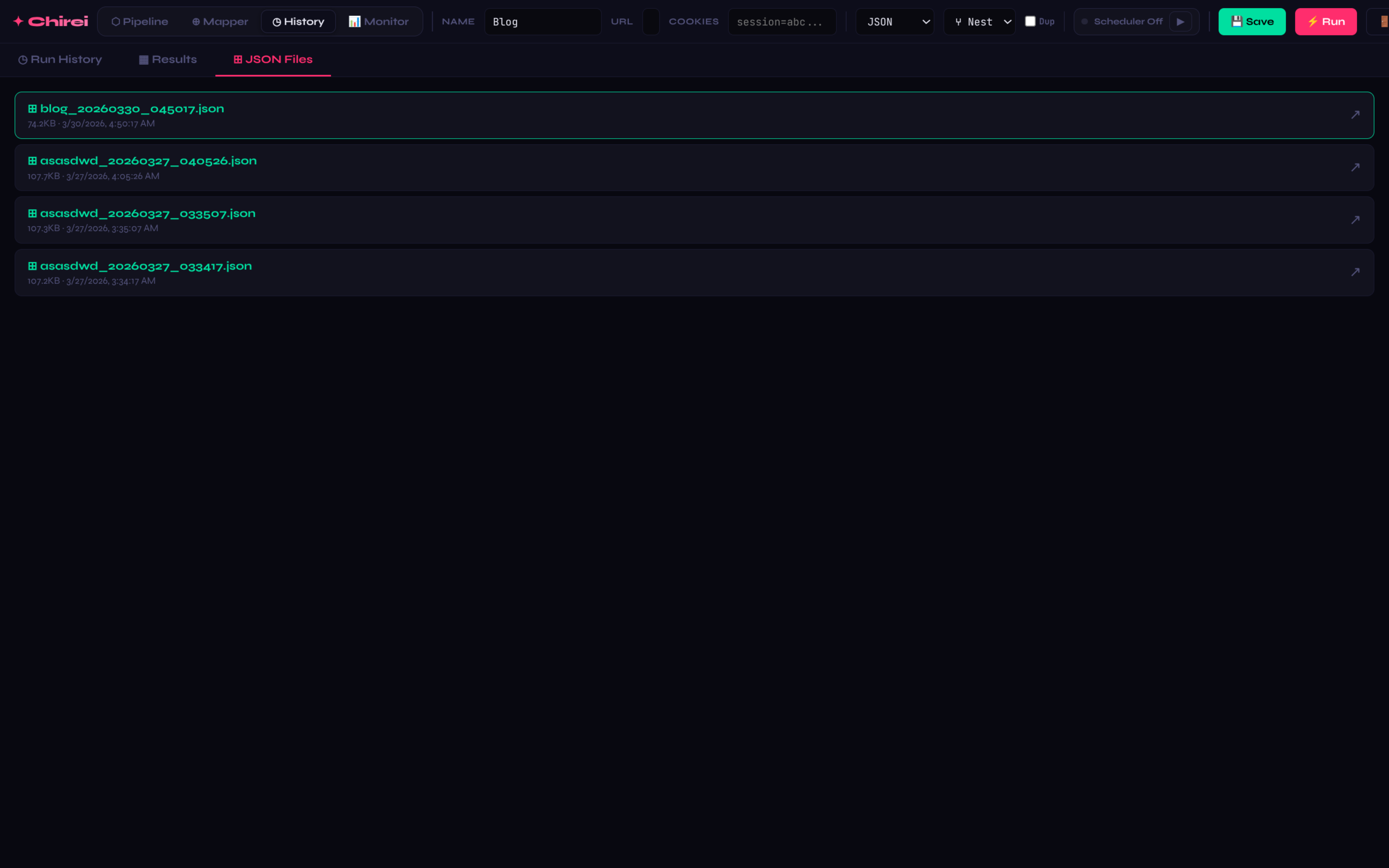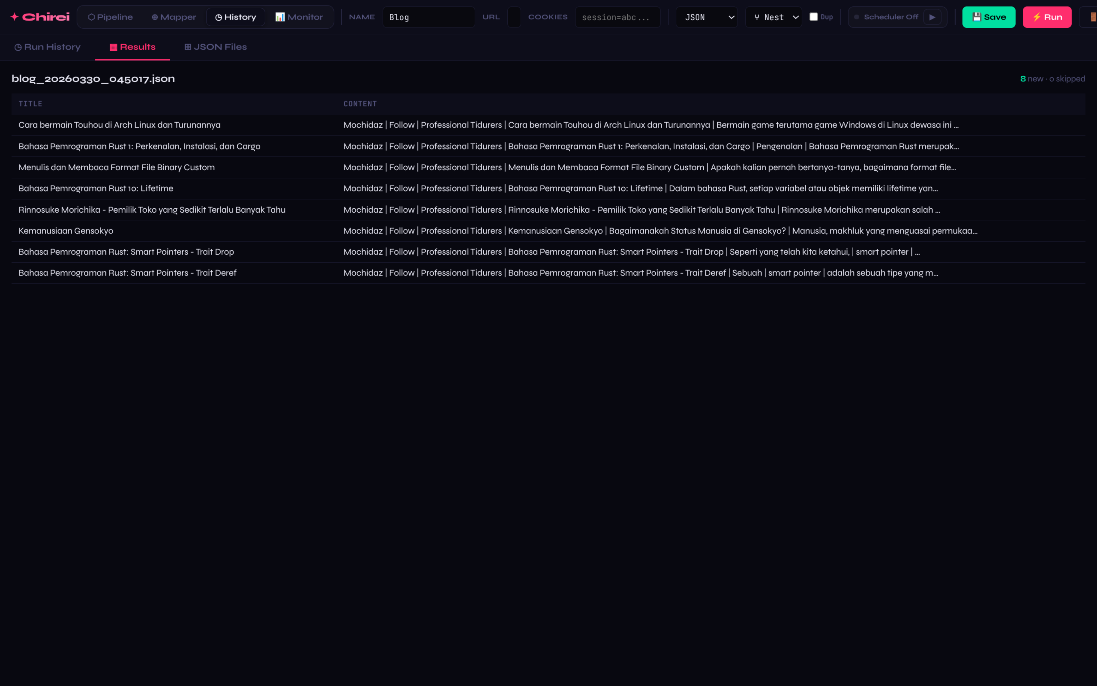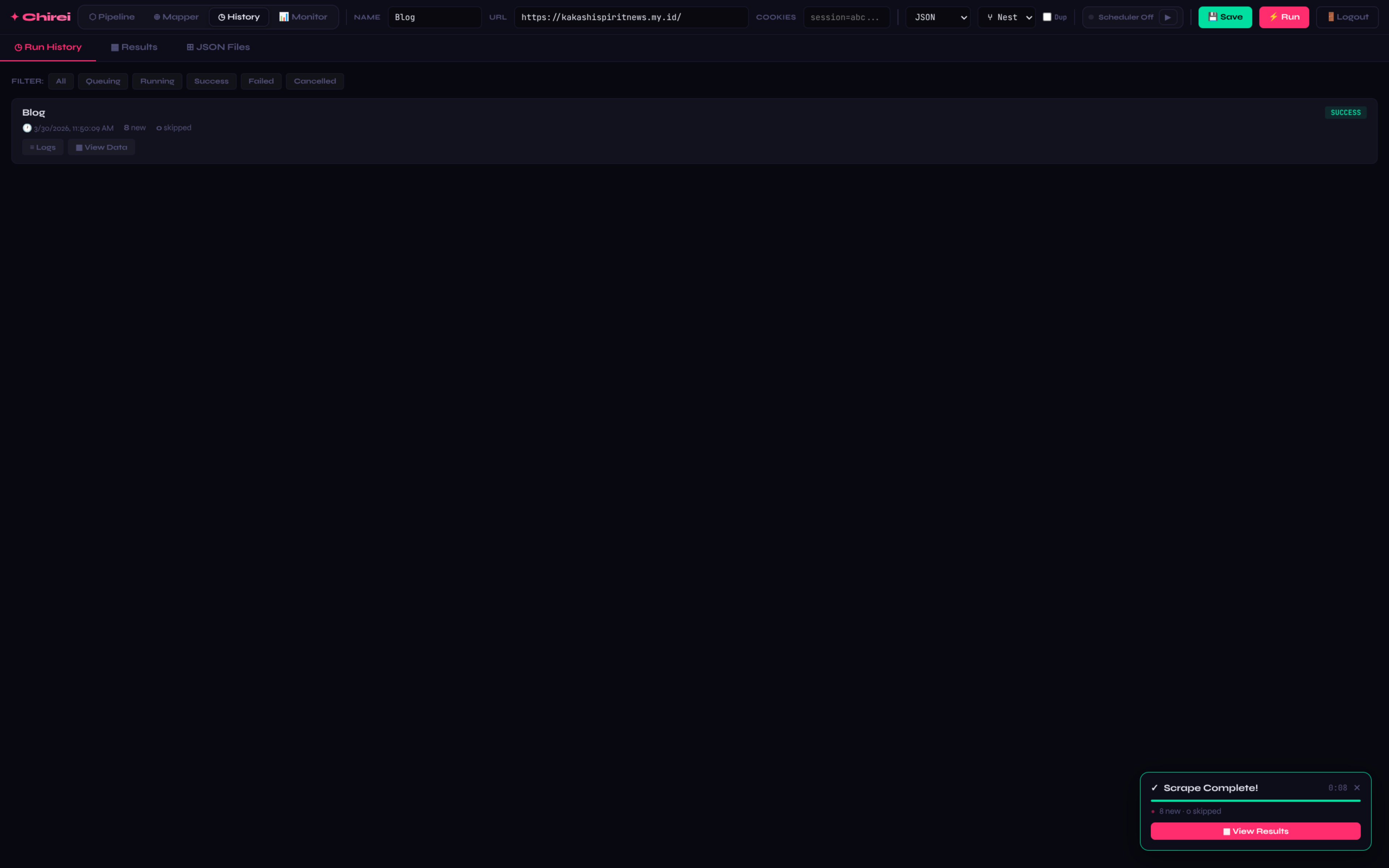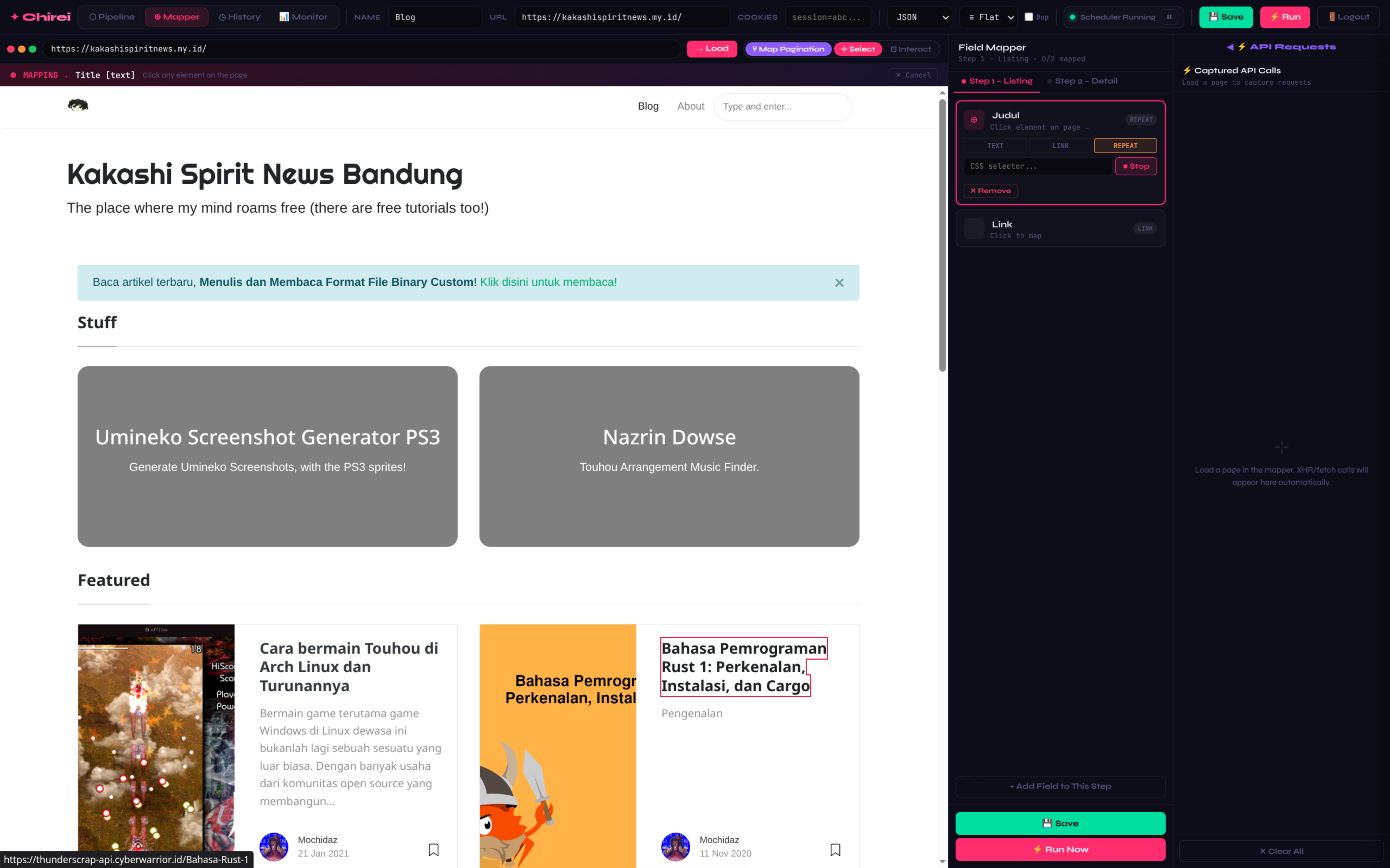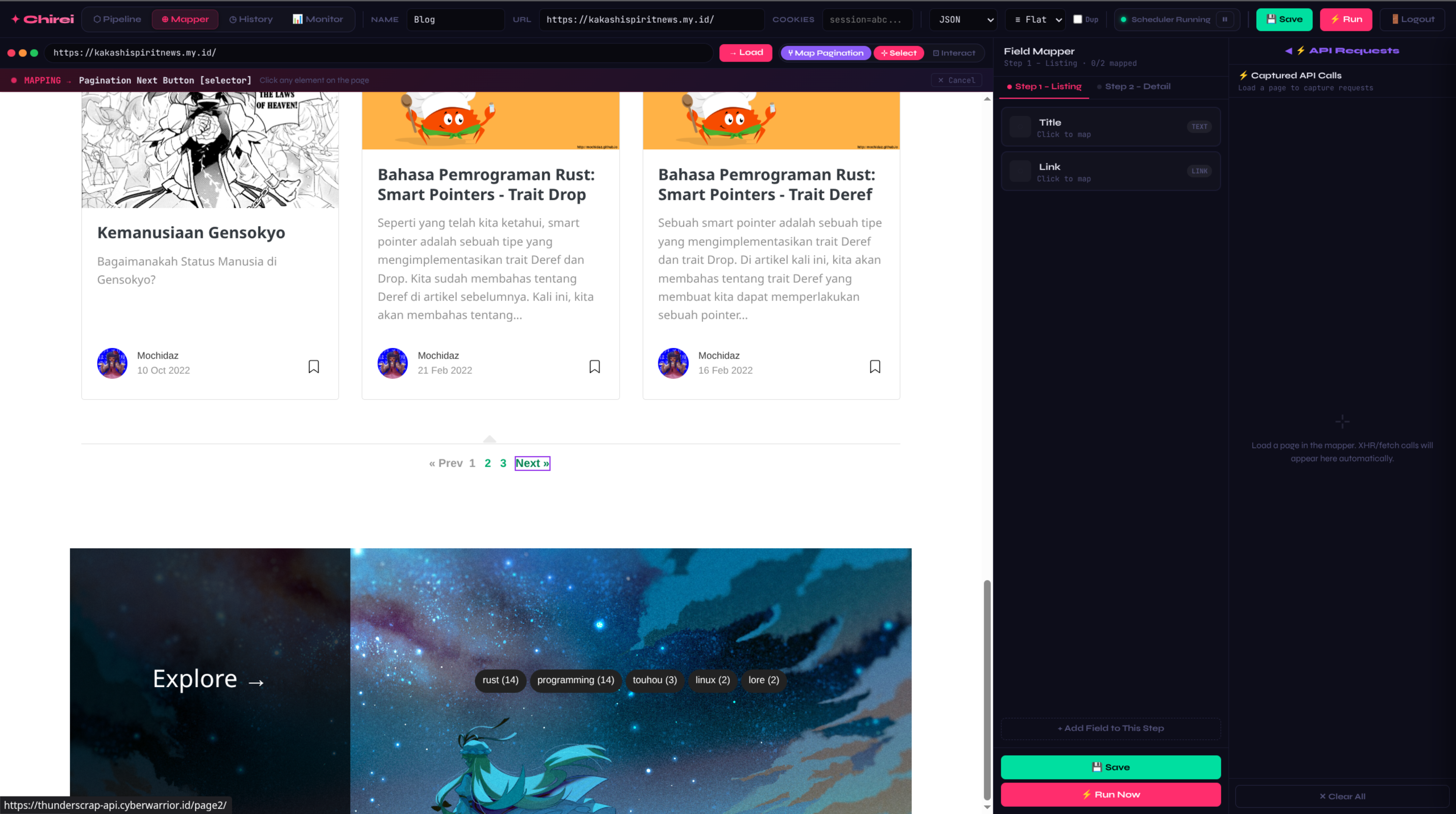 Chirei adalah web scraper yang dikonfigurasi secara visual dan dirancang untuk mempermudah alur ekstraksi multi-langkah (Listings, Detail Pages, Fanouts). Dibangun dengan FastAPI, Celery, Redis, dan PostgreSQL, Chirei sangat skalabel dan cocok untuk lingkungan staging maupun produksi.
